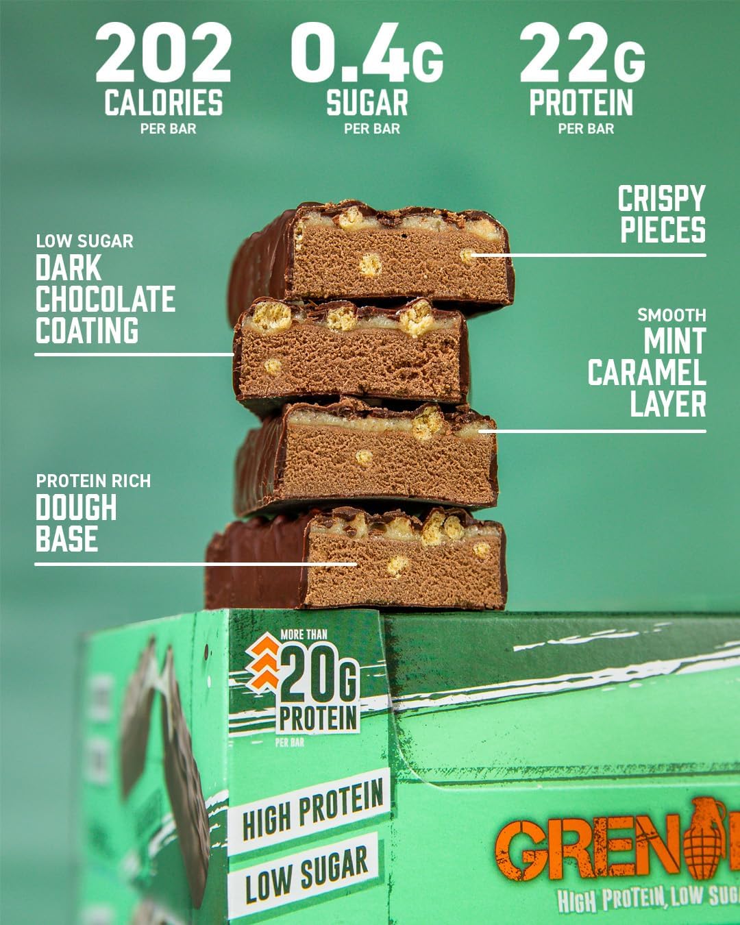 Resting on top of a rich chocolate nougat base, this triple-layered high-protein treat features the perfect pairing of dark chocolate with fresh mint caramel. In its arsenal is 22g of protein and only 0.4g of sugar, making it a great low-carb, high-protein bar.