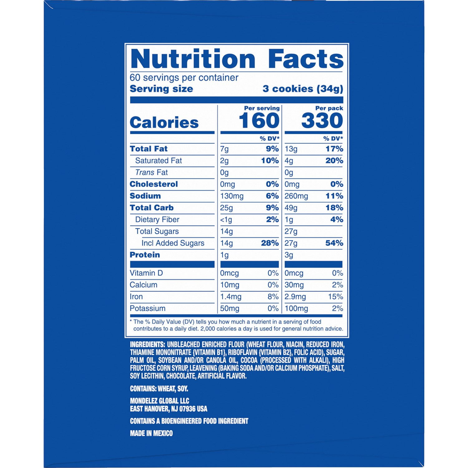 Ingredients: Unbleached Enriched Flour (Wheat Flour, Niacin, Reduced Iron, Thiamine Mononitrate {Vitamin B1}, Riboflavin {Vitamin B2}, Folic Acid), Sugar, Palm And/Or Canola Oil, Cocoa (Processed With Alkali), High Fructose Corn Syrup, Leavening (Baking Soda And/Or Calcium Phosphate), Salt, Soy Lecithin, Chocolate, Artificial Flavor. Contains Wheat And Soy.