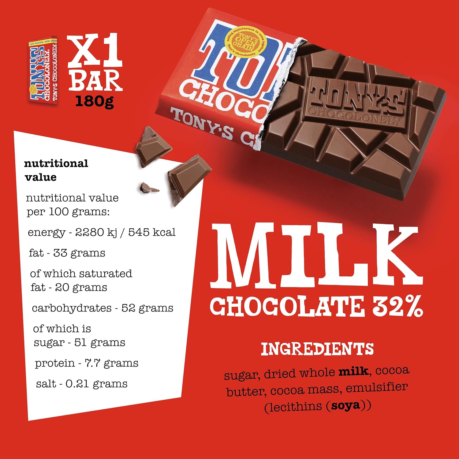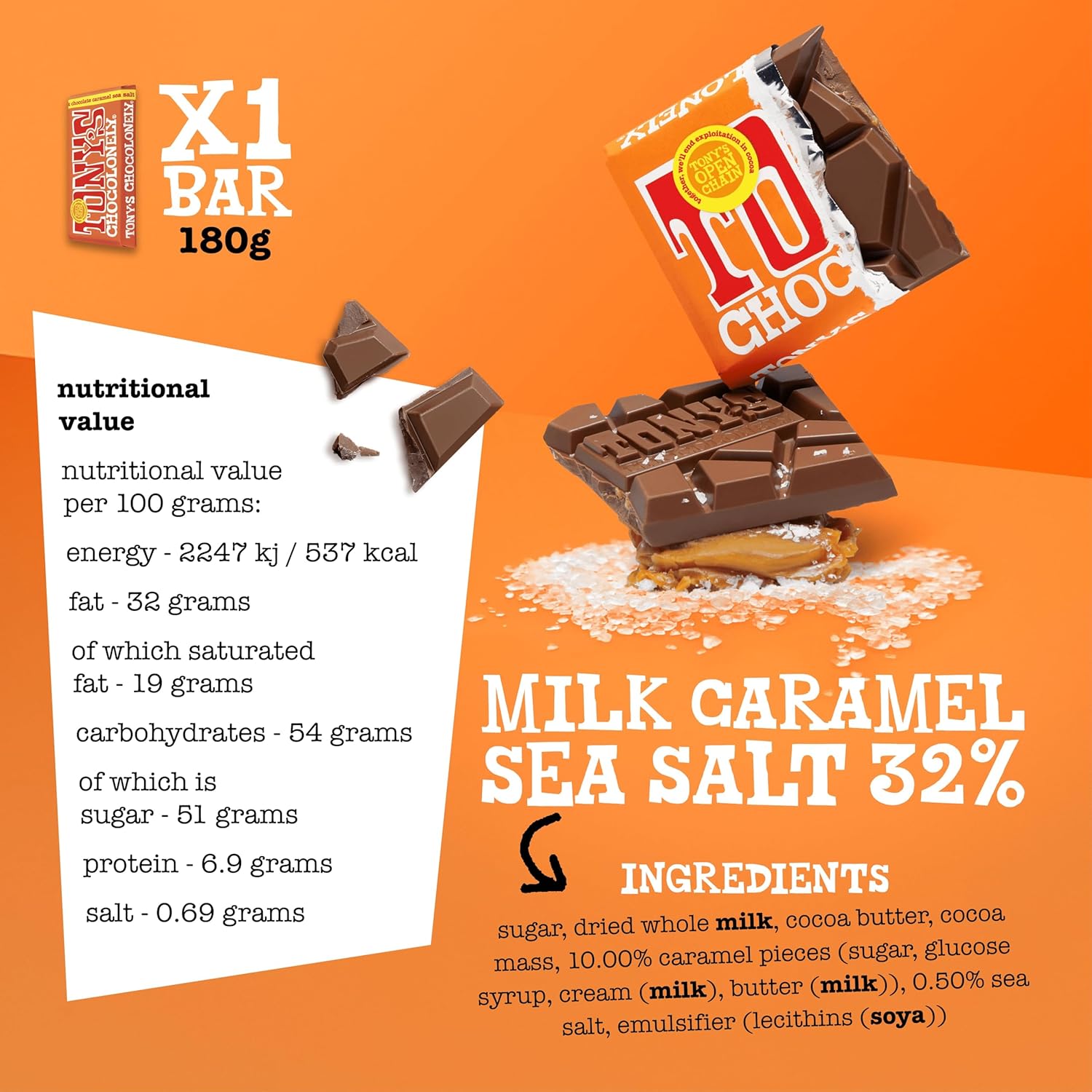 - This package contains 1 x Tony’s Chocolonely Chocolate Bar: Milk chocolate with Caramel and Sea Salt