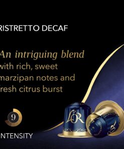 L’OR Espresso Ristretto Decaf delivers a rich. full-bodied decaffeinated espresso experience with a fine golden crema. Expertly crafted by L’OR Coffee Artists. this intensity 9 blend reveals layered notes of marzipan. fresh citrus. toasted almonds. and subtle spice. creating a vibrant and complex flavor profile in every cup.