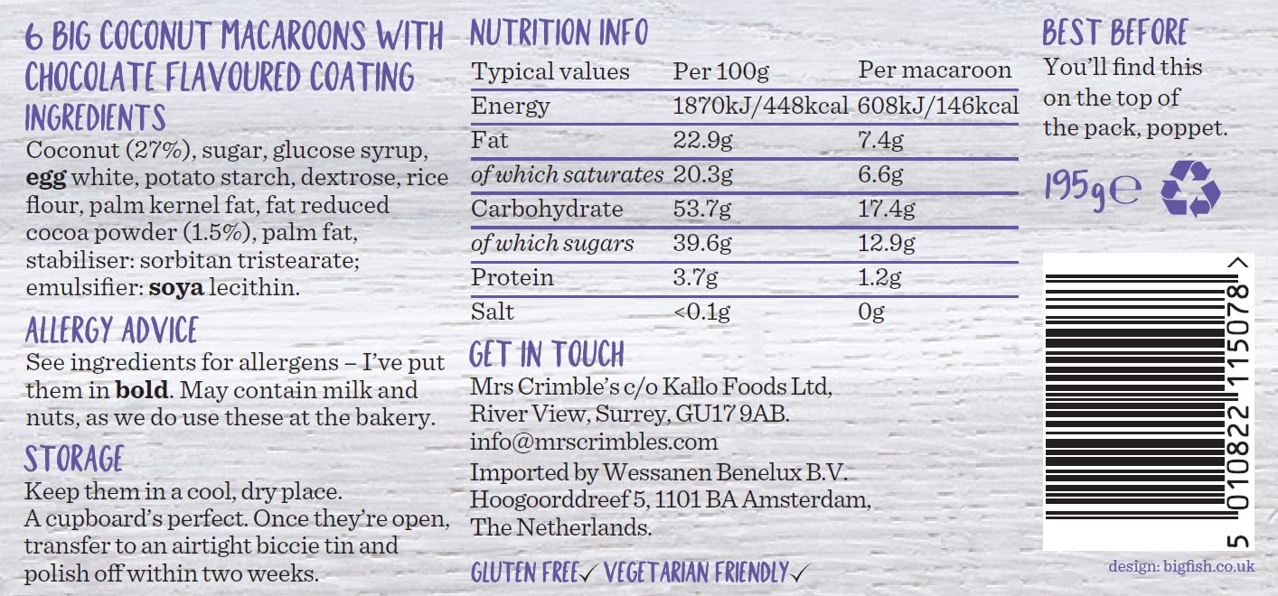 Mrs Crimbles Big Chocolate Macaroons offer a deliciously rich and golden treat with a lovely moist texture and a generous sprinkling of coconut. Each pack contains 6 large. gluten-free macaroons crafted with care for those who enjoy indulgent. high-quality bakery treats. Perfect for vegetarians and ideal for sharing or savoring one at a time.