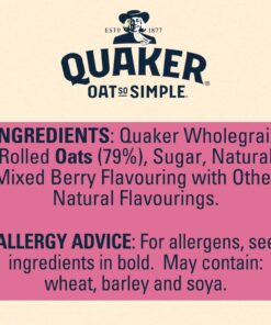 Quaker Wholegrain Rolled Oats (79%). Sugar. Natural Mixed Berry Flavouring with Other Natural Flavourings.