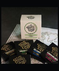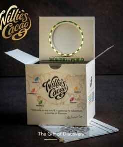 100% natural. soya free. gluten free. and palm oil free. these artisan chocolates are ethically sourced through Direct Trade. Willie Harcourt-Cooze. a pioneering cacao farmer and founder of the UK’s first bean-to-bar chocolate factory. ensures farmers are fairly compensated. going beyond Fair Trade standards. The set also includes a beautifully illustrated map of Willie’s Wondrous World of Cacao.