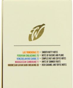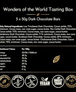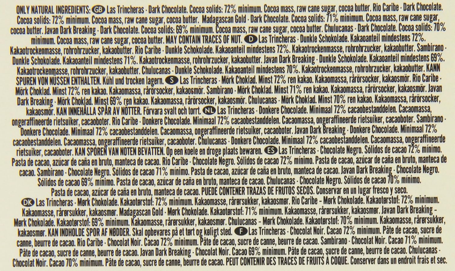 This luxury gift box includes: Las Trincheras (Venezuela) with 72% cocoa solids. Rio Caribe (Venezuela) with 72% cocoa solids. Sambirano (Madagascar) with 71% cocoa solids. Surabaya (Indonesia) with 69% cocoa solids. and Chulucanas (Peru) with 70% cocoa solids. All are made in small batches at low temperatures over up to 21 days to preserve the delicate. natural flavours.